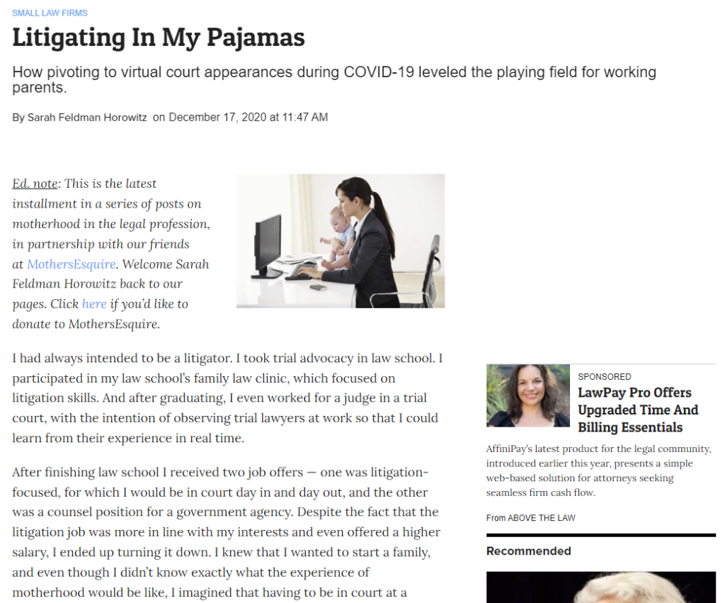 As part of a series of posts on motherhood in the legal profession, Sarah Horowitz recently wrote an article for Above The Law in which she discussed how pivoting to virtual court appearances during COVID leved the playing field for working parents.